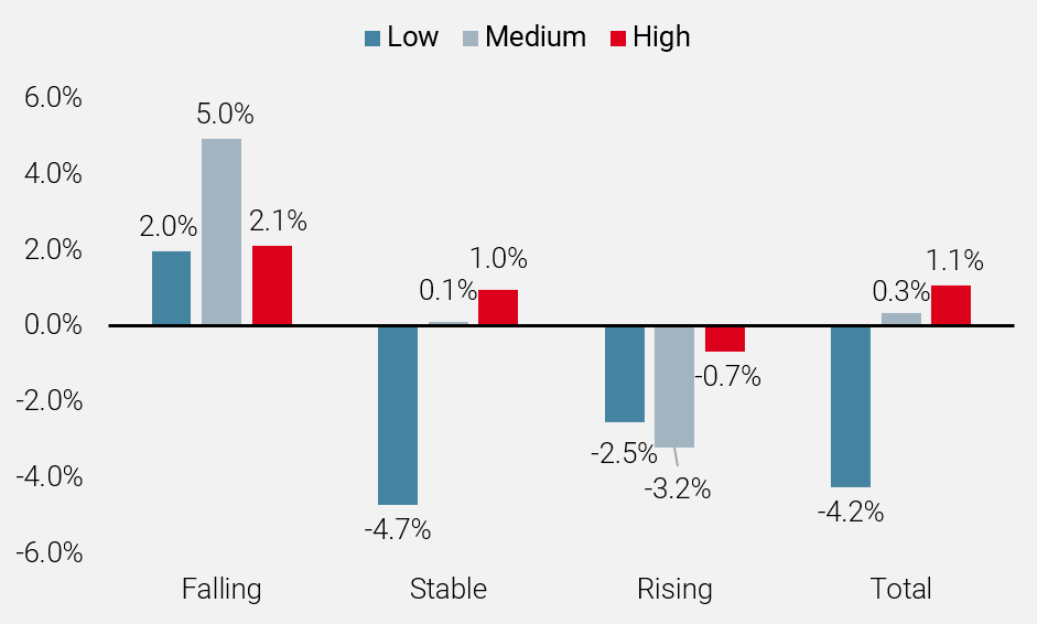 For example, below is the realised performance (average monthly excess return) of our European equity strategy during periods of low/medium/high interest rates, and also looking at the three-month trend (rising –stable – falling). We clearly see (Chart 10) that high interest rates create a positive regime, and falling interest rates are also very supportive.